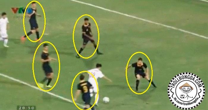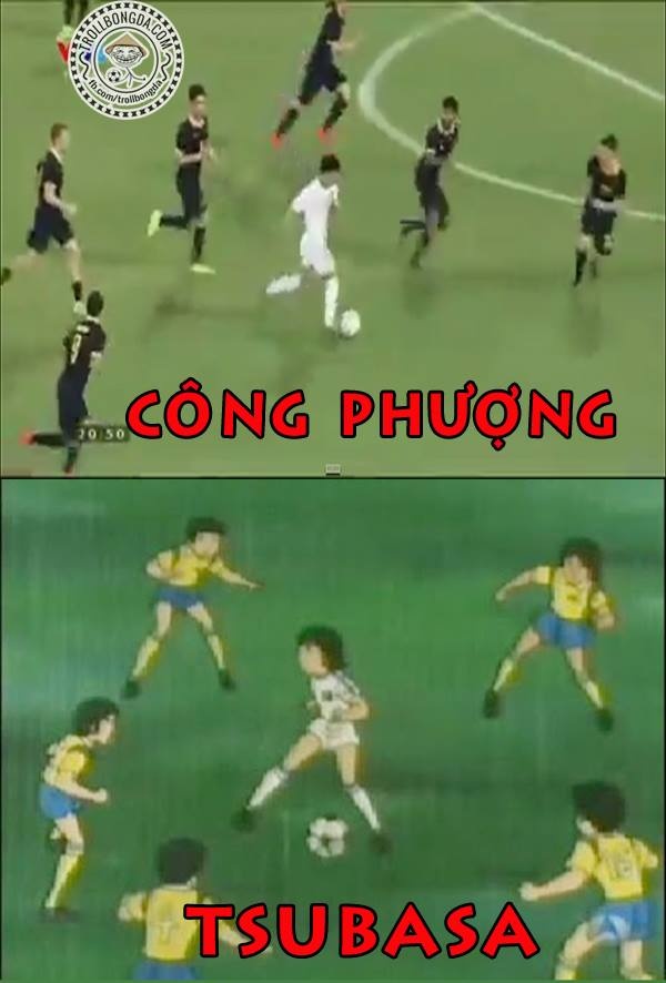 | Hình ảnh Công Phượng đi bóng trong vòng vây của các cầu thủ U19 Australia giống với nhân vật Tsubasa trong bộ truyện tranh nổi tiếng của Nhật Bản. |