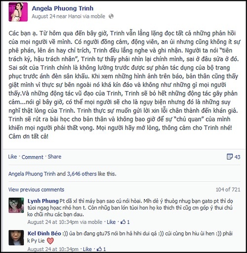 | Trong tuần vừa rồi, Angela Phương Trinh cũng là tâm điểm chú ý của dư luận khi xuất hiện trong một quán bar Hà Nội với bộ trang phục có cũng như không. Sau khi bị dư luận chỉ trích và Sở Văn hóa Hà Nội “đe” sẽ phạt nặng, “bà mẹ nhí” đăng đàn xin lỗi trên trang cá nhân. Tuy nhiên, với nhiều người, cô đã trở thành “chú bé chăn cừu”, liên tục nói dối nên chẳng ai còn tin vào những chia sẻ hay hứa hẹn của cô. |