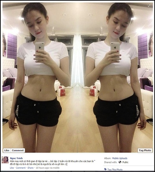 | Ngọc Trinh lại một lần nữa khoe vòng eo con kiến thon thả khiến các fan vô cùng ghen tỵ. “Nữ hoàng nội y” cũng nhắn nhủ nếu đã tập thể dục để giữ vóc dáng thì không được bỏ ngang: “Bỏ là người bị xồ ra ghê lắm”. |