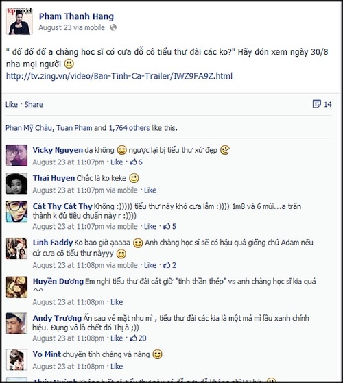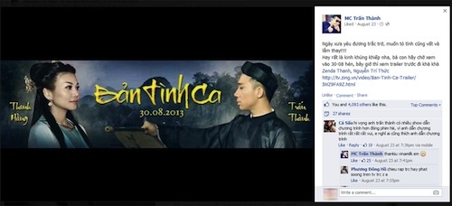 | Cùng thời điểm đó, MC Trấn Thành cũng chia sẻ đoạn clip này trên Zing TV. Độc đáo hơn người đồng nghiệp, anh đăng tải cả một tấm poster mình đối mặt cùng Thanh Hằng. Dẫu vậy, cả chàng và nàng đều không tiết lộ bất cứ thông tin nào về dự án này khiến các fan phấp phỏng đoán mò mà không hiểu đầu đuôi ra sao. |