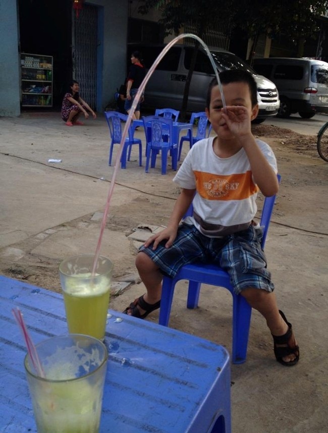 | Đây là cách thằng cu em uống nước. |