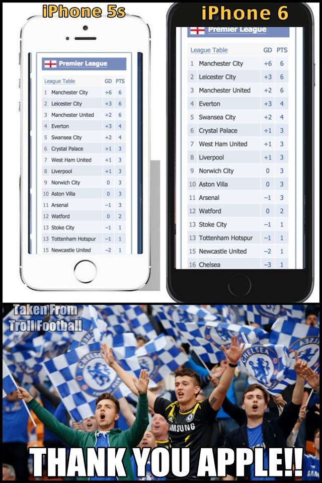 Người hâm mộ Chelsea cảm ơn hãng Apple, bởi nhờ iPhone 6 nên họ mới xem được vị trí của Chelsea trên bảng xếp hạng. Sau 2 vòng đầu," The Blues" đứng thứ 16 với 1 điểm.