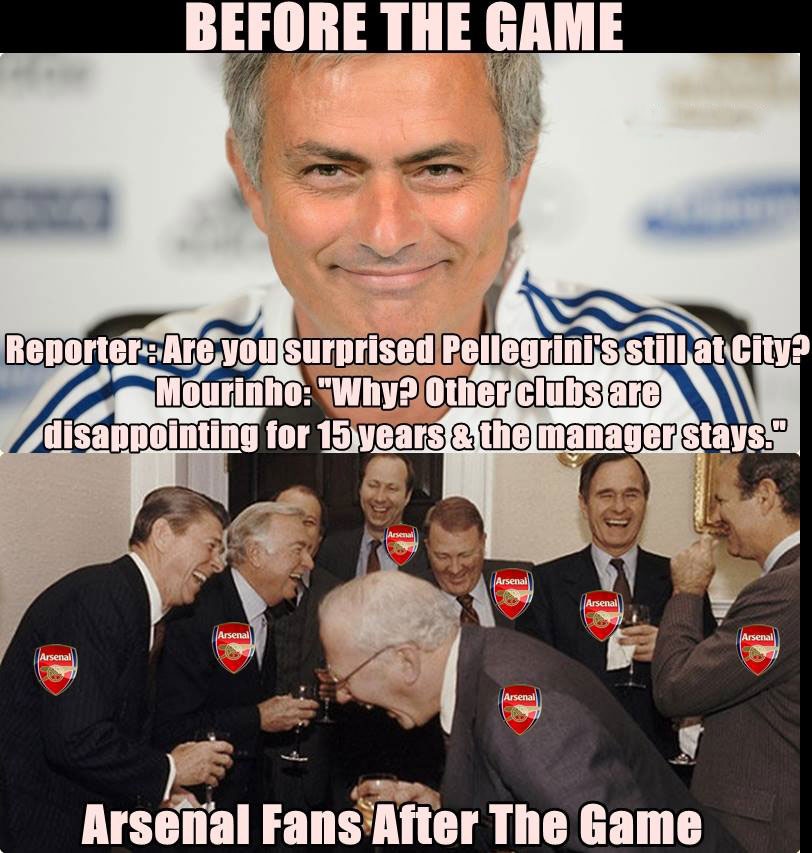 Trước trận đấu, HLV Jose Mourinho phát biểu nhằm chế giễu Arsene Wenger của Arsenal khi nhận được câu hỏi: "Có ngạc nhiên khi Pellegrini vẫn dẫn dắt Man City hay không? Ông lại đưa ra câu trả lời đá xoáy đồng nghiệp Wenger: "Tại sao có những đội bóng gây thất vọng trong 15 năm, nhưng huấn luyện viên không bị sa thải". Câu nói ám chỉ HLV Wenger không thể cùng Arsenal vô địch Premier League hơn 10 năm qua.