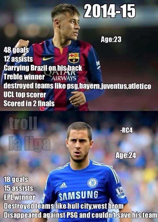 Eden Hazard thậm chí còn chưa chứng tỏ được khả năng như ngôi sao trẻ Neymar của Barcelona (La Liga) ở những trận đấu lớn.