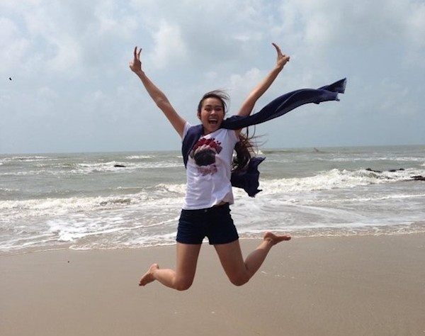| Với bản tính năng động và tinh nghịch nên khi đi quay phim ở biển, cô nàng đã thả phanh nghịch ngợm. Có lẽ hiếm có bà mẹ nào nhí nhảnh và trẻ trung như vậy. |