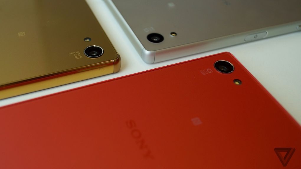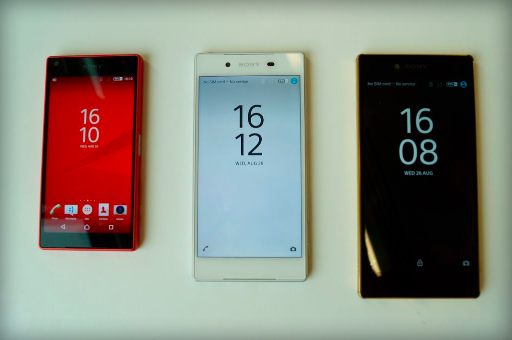 Cận cảnh bộ 3 Xperia Z5 Premium (vàng), Xperia Z5 (bạc) và Xperia Z5 Compact (đỏ).