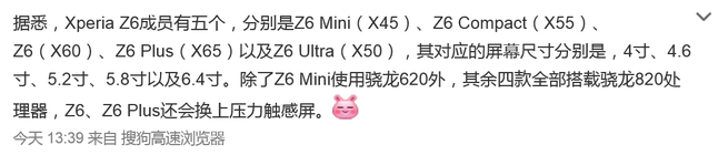 Những thiết bị này bao gồm Xperia Z6, sản phẩm chủ lực với màn hình 5,2 inch, Xperia Z6 Compact màn hình 4,6 inch, Xperia Z6 mini 4 inch, Xperia Z6 Plus 5,8 inch và phiên bản Z6 Ultra lớn nhất với 6,4 inch.
