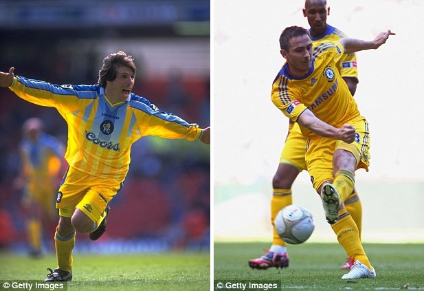 | Gần hơn, những năm 1990 Gianfranco Zola (trái) cũng từng tỏa sáng trong màu áo này. Lần gần nhất, Frank Lampard (phải) cùng các cầu thủ Chelsea mặc màu áo vàng tại trận chung kết FA Cup năm 2009. |