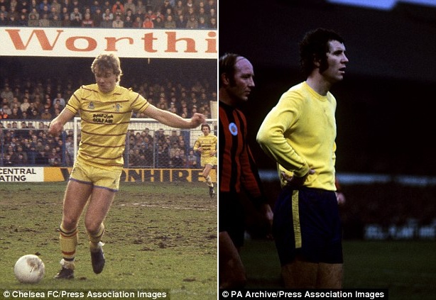 | Thiết kế và màu vàng chanh của mẫu áo gợi cho người hâm mộ nhớ tới trang phục của những huyền thoại Chelsea thập niên 60 như Kerry Dixon (trái) và Peter Osgood (phải). |