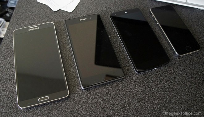 Thực vậy, chiếc Galaxy Note 3 của Samsung với màn hình 5,7 inch nhìn vượt trội về kích cỡ so với màn hình 4 inch của iPhone 5S.