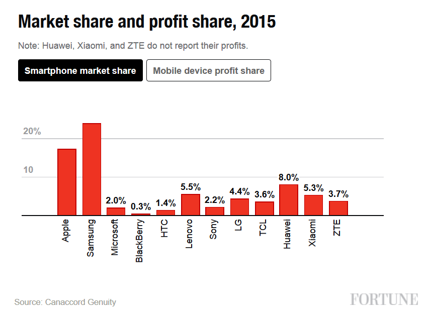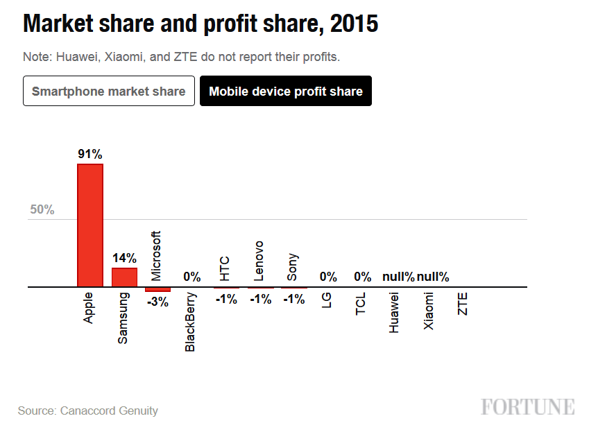 Tổng cộng, Samsung và Apple chiếm đến 105% lợi nhuận của ngành công nghiệp di động. Sở dĩ con số này cao hơn 100% vì phần lớn nhà sản xuất còn lại đều chịu lỗ, chẳng hạn Microsoft, HTC, Sony. Một số hãng di động Trung Quốc – vốn có doanh số smartphone khá lớn thời gian qua như Huawei, Xiaomi, ZTE đều không có lãi.