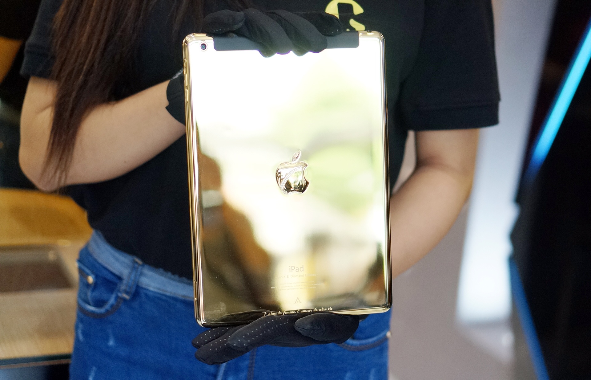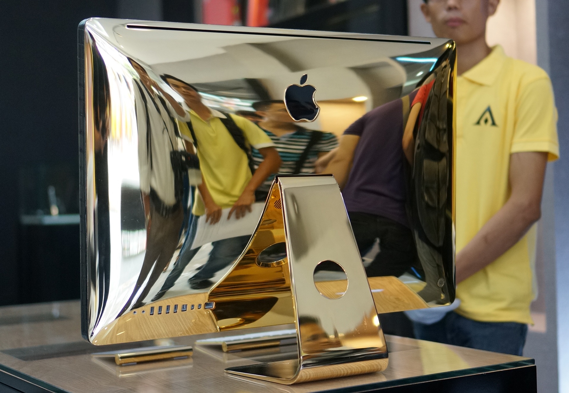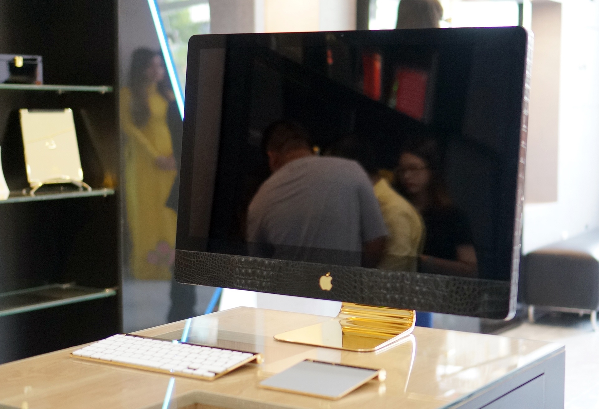 | iMac mạ vàng là sản phẩm mới nhất trong bộ sưu tập các thiết bị Apple của Golden Ace. Chiếc máy tính này có giá chế tác lên đến 270 triệu và hiện được trưng bày tại TP.HCM. |