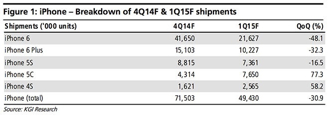Với kinh nghiệm của mình, Kuo lo ngại đến đầu năm 2015, doanh số của iPhone sẽ suy giảm, ngoại trừ iPhone 5C và iPhone 4S. Đây là hai model tuy cũ nhưng do có giá bán thấp nên vẫn thu hút được người dùng. iPhone 5C sẽ có doanh số tăng 77,3% trong quý I/2015, trong khi đó, doanh số iPhone 4S sẽ tăng 58,2% nhờ sức mua tại các thị trường mới nổi.