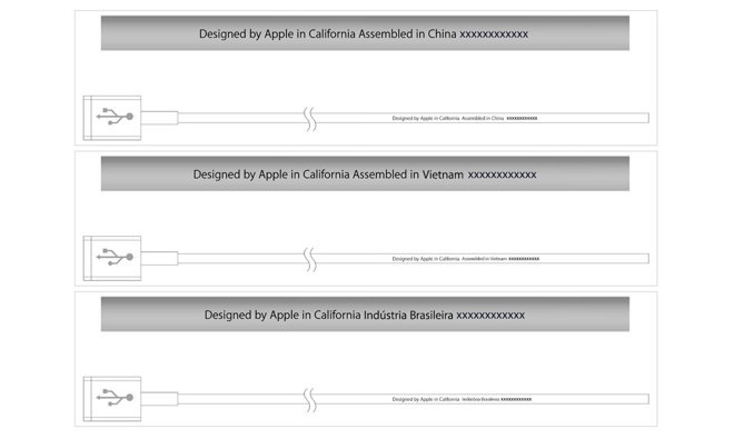 Trước đây, thông tin trên sợi cáp Lightning chỉ ghi “Thiết kế bởi Apple tại California” và “sản xuất tại Trung Quốc” (Designed by Apple in California, Assembled in China). Tới đây, sẽ có thêm loại cáp Lightning với dòng chữ “Assembled in Vietnam” và “Industria Brasileira”. Dòng chữ này được ghi ở khoảng cách 7 inch, tính từ cổng kết nối USB.