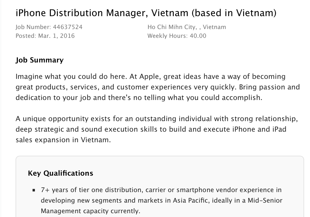 | Mẩu tin tuyển dụng của Apple tại Việt Nam. |