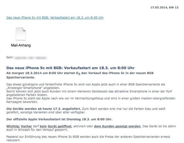 | Một email được gửi từ Đức thông báo về kế hoạch bán iPhone 5C 8GB của Apple. Ảnh: Engadget. |