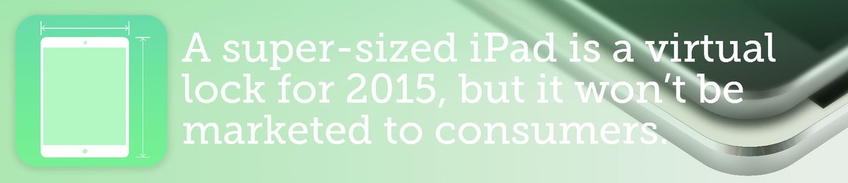 Theo Mashable, gần như chắc chắn táo khuyết sẽ ra mắt một chiếc iPad 12,9 inch trong năm sau. Không dễ dàng để thuyết phục các doanh nghiệp thay thế máy tính Windows bằng máy Mac, nhưng thêm một màn hình iPad cỡ lớn để có thể làm việc tại văn phòng hoặc trên đường đi là điều khả thi.