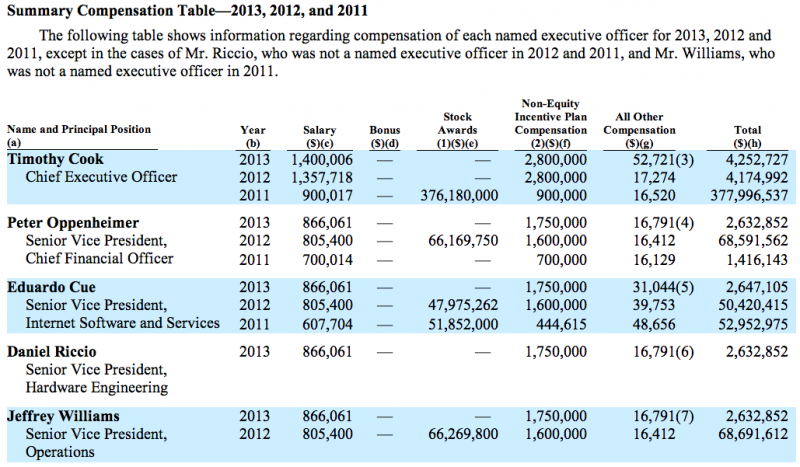 Tổng thu nhập của Tim Cook bao gồm 1,4 triệu USD tiền lương cơ bản và 2,85 triệu USD tiền thưởng cùng các khoản ngoài lương khác. Mức thu nhập này gây bất ngờ cho nhiều người vì nó chỉ "nhỉnh" hơn chút ít so với 4,22 triệu USD năm 2012. Con số này cũng hoàn toàn trái ngược với 378 triệu USD mà Cook từng được nhận vào năm 2011, khi ông đảm nhiệm vai trò CEO và nhận 1 triệu cổ phiếu từ Apple.