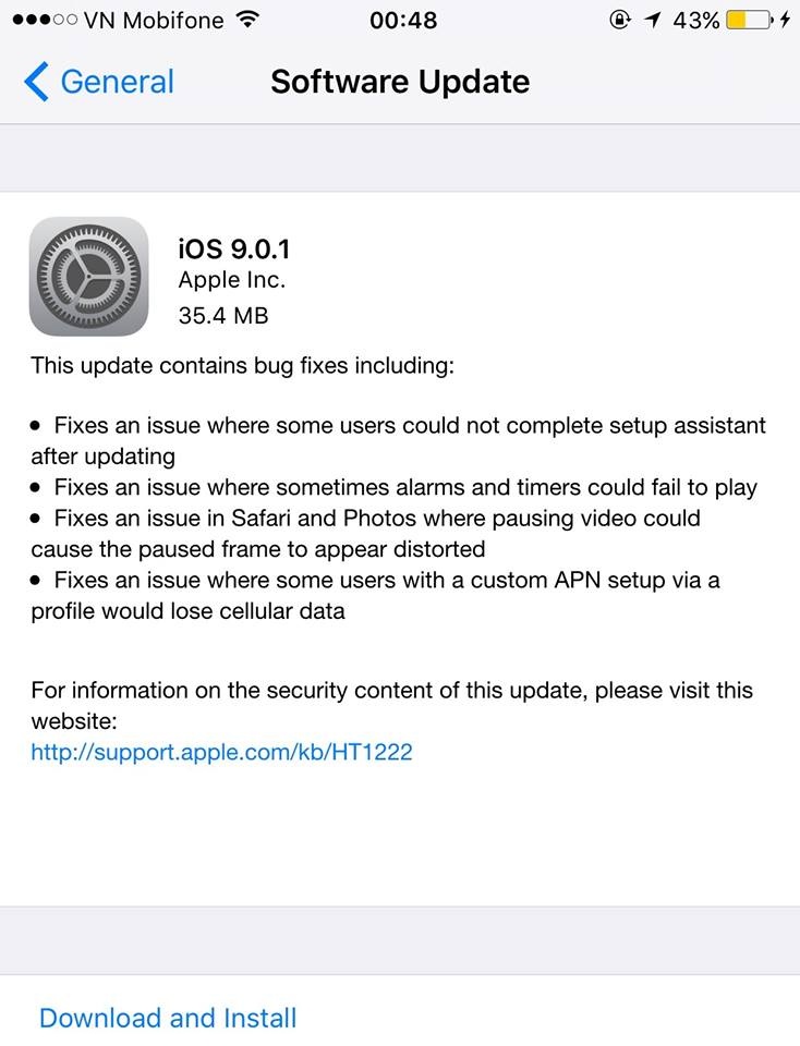 | iOS 9.0.1 có dung lượng nhỏ và cài đặt nhanh. |