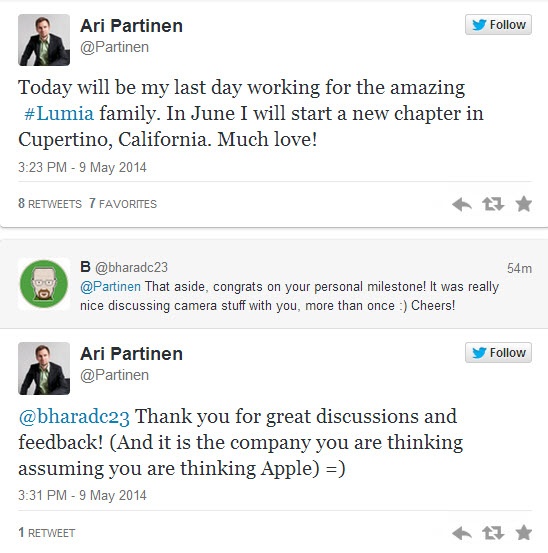 Trên tài khoản Twitter của mình, vị kĩ sư cho biết anh sẽ "bắt đầu một chương mới" tại Cupertico, California, nơi mà ai cũng biết là đại bản doanh của Apple. Sau đó, Ari cũng đã chính thức xác nhận rằng ông chủ mới của mình chính là Tim Cook.