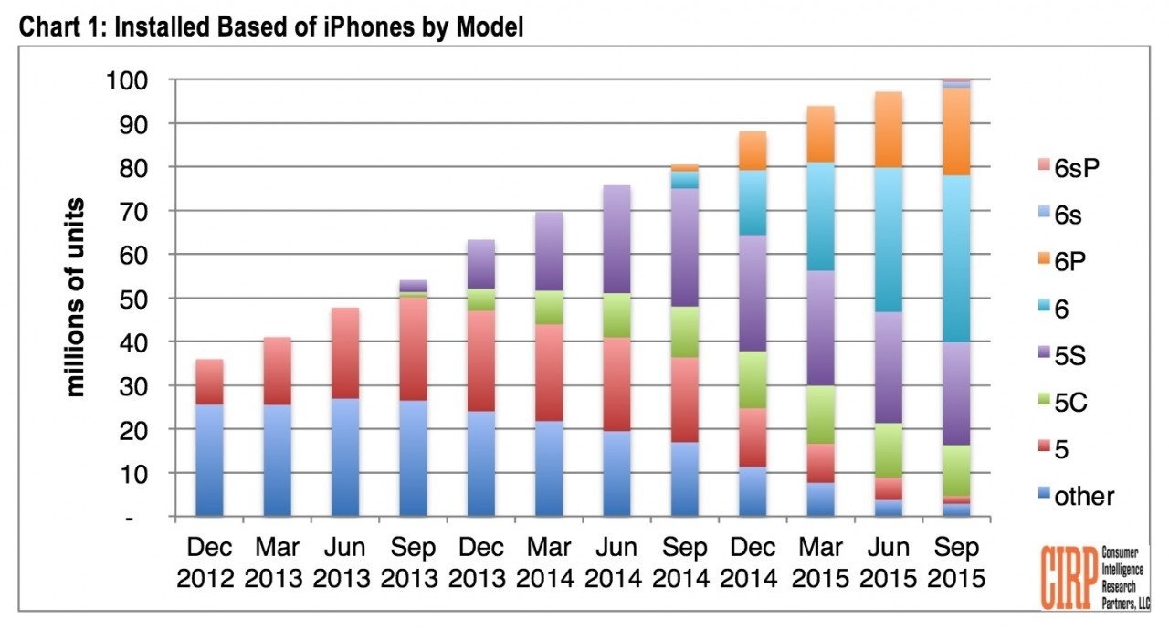 Tổ chức Consumer Intelligence Research Partners đã phân tích các báo cáo và phân tích dữ liệu từ người dùng iPhone - bao gồm cả thiết bị họ chọn - sau đó thống kê dữ liệu bán hàng của Apple. Họ ước tính số lượng người dùng iPhone đã tăng 8% mỗi quý trong suốt 8 quý vừa qua, giải thích cho cột mốc trên.