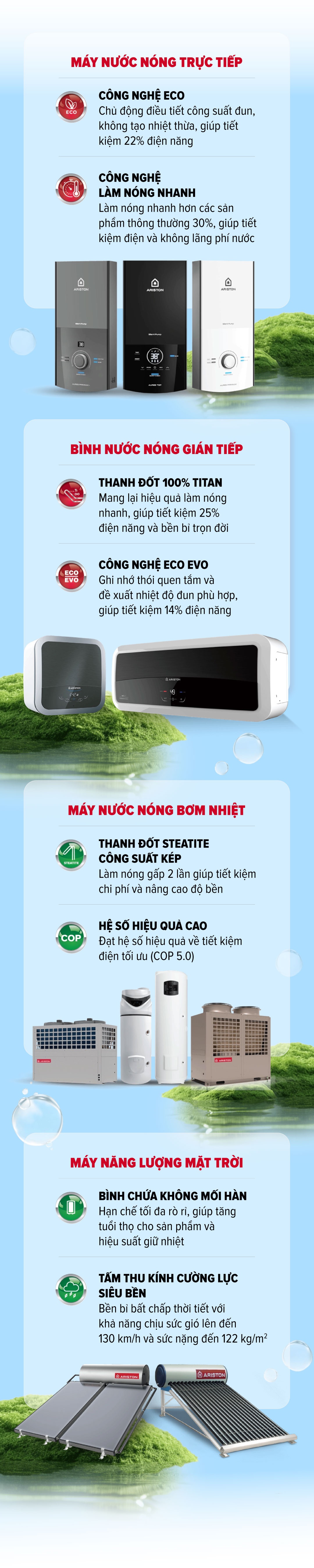 Cụ thể, với sứ mệnh “Tổ ấm thư thái, bền vững tương lai”, Ariston theo đuổi triết lý sản phẩm tạo nên sự khác biệt, bao gồm: Yếu tố bền bỉ để hạn chế việc phải thay mới, ưu tiên sử dụng nguồn nguyên liệu tái chế và tăng cường tích hợp các tính năng tiết kiệm năng lượng vào từng sản phẩm, tập trung phát triển các giải pháp nước nóng dùng năng lượng tái tạo nhưng vẫn đảm bảo hiệu quả.