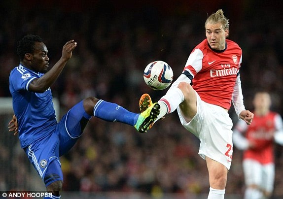 | Mikel có pha tranh bóng quyết liệt với Bendtner. |