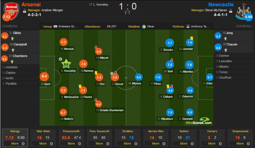 Arsenal bước vào trận đánh đầu tiên trong năm 2016 bằng quyết tâm cao độ. Tuy nhiên, trước sức kháng cự mạnh mẽ từ Newcastle – đội bóng cũng rất khát điểm cho cuộc đua trụ hạng, thầy trò huấn luyện viên Arsene Wenger gặp không ít khó khăn. Dẫu vậy, khoảnh khắc lóe sáng của trung vệ Laurent Koscielny cũng đủ giữ 3 điểm quan trọng ở lại sân Emirates.