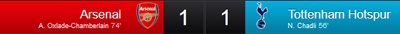 74': Arsenal có bàn gỡ hòa 1-1 do công của Chamberlain bằng cú sút quyết đoán trong khu vực 16m50.