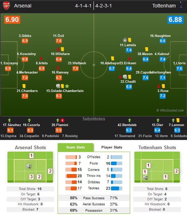 14': Arsenal có pha phản công nguy hiểm, nhưng đáng tiếc là cú sút trong khu vực 16m50 của Welbeck bị hậu vệ Tottenham chặn lại.