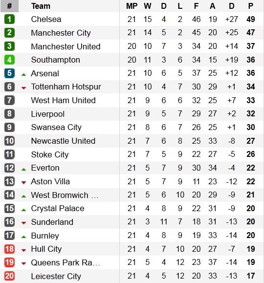 | Bảng xếp hạng vòng 21 Ngoại hạng Anh 2014/15. |