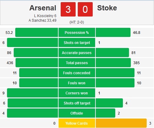 Đúng lúc này trọng tài Jon Moss thổi còi kết thúc trận đấu giữa Arsenal và Stoke City. Chung cuộc, Pháo thủ thành London giành chiến thắng với tỷ số cách biệt 3-0.