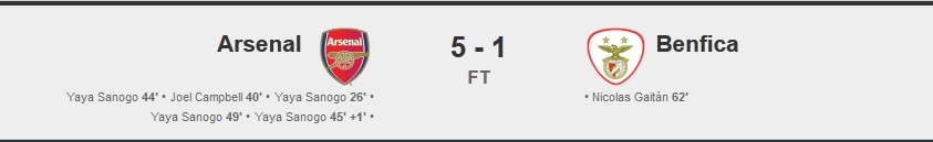 Đúng lúc này trọng tài thổi còi kết thúc trận đấu giữa Arsenal và Benfica. Chung cuộc, Pháo thủ giành chiến thắng với tỷ số áp đảo 5-1.