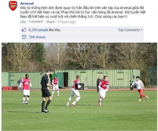 Trang facebook chính thức của Arsenal vừa đăng tải clip về trận giao hữu giữa U19 Việt Nam - U19 Arsenal. Clip có MC và lời dẫn bằng tiếng Việt nhờ sự cộng tác của một thành viên nữ thuộc Hội CĐV Arsenal. Kèm theo clip là ghi chú tiếng Việt khiến người hâm mộ bóng đá Việt Nam thích thú.