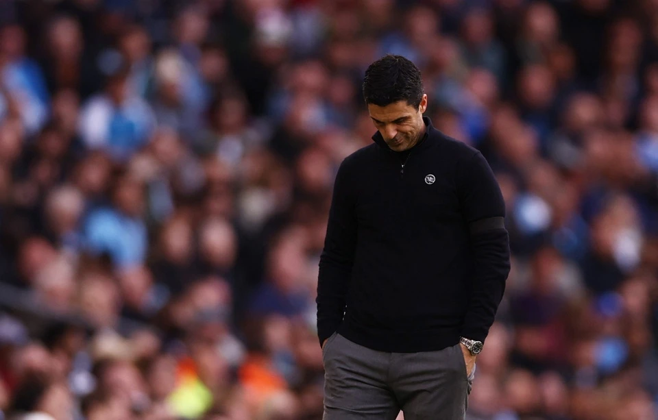 Mikel Arteta thất vọng khi Arsenal thua Man City.