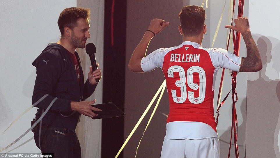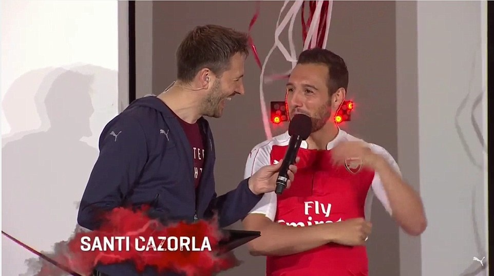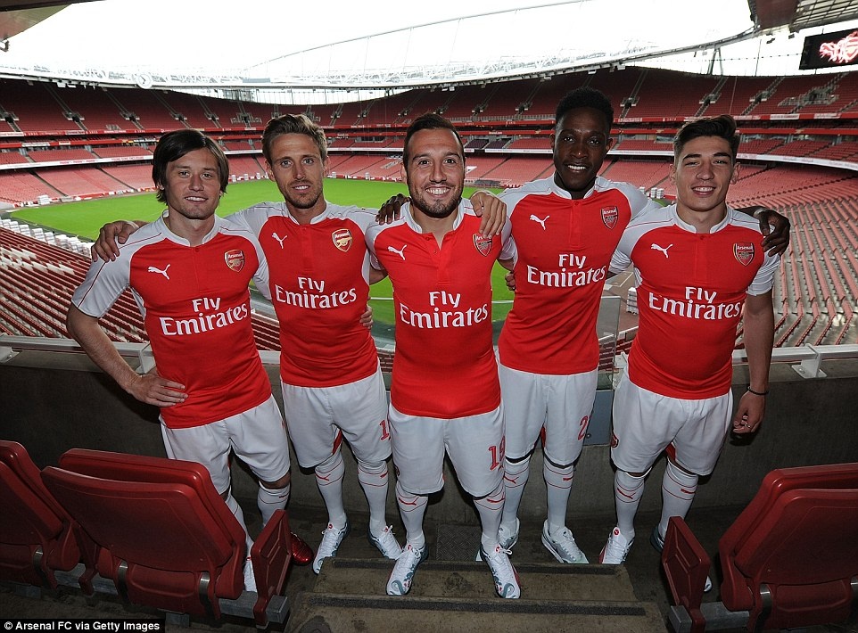 | Hector Bellerin, Tomas Rosicky, Santi Cazorla, Danny Welbeck và Nacho Monreal (từ trái qua phải) tham gia buổi công bố mẫu áo đấu sân nhà mùa tới của Arsenal. |