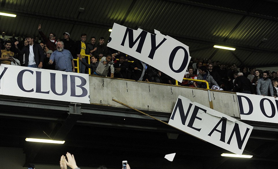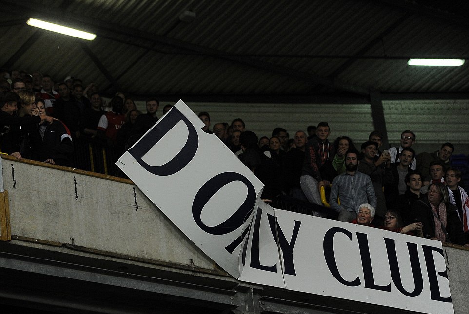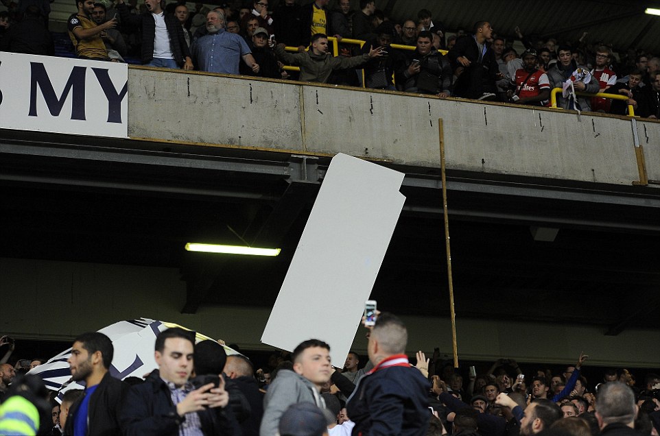 | Chứng kiến đội nhà đánh bại đối thủ không đội trời chung, nhóm Gooners phấn khích dỡ tung tấm pano vốn là biểu tượng của Spurs trên sân White Hart Lane. |