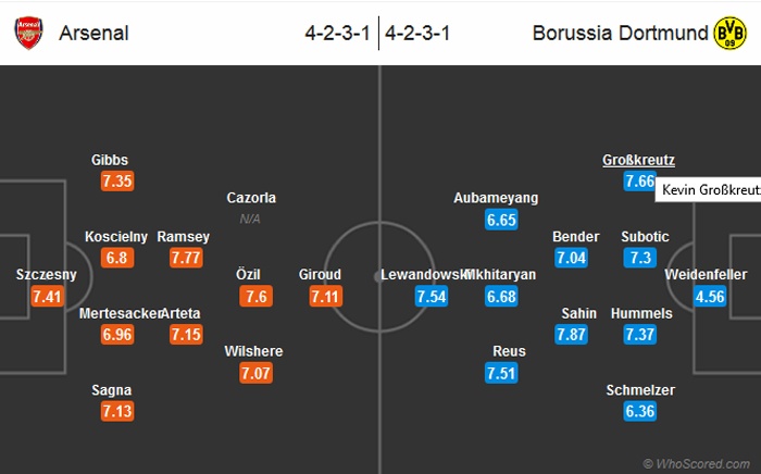 Trong khi danh sách thương binh của Arsenal dài thêm thì Dortmund lại được chào đón sự trở lại của hàng loạt hảo thủ. Thủ thành Weidenfeller đã mãn hạn treo giò. Marcel Schmelzer, Sebastian Kehl, Sven Bender, Jonas Hofmann và Marco Reus đã hoàn toàn bình phục chấn thương, có thể ra sân thi đấu ngay từ đầu trong cuộc thư hùng với Arsenal. Dồi dào về lực lượng cầu thủ, tuy nhiên, đại diện của Đức lại không có được sự chỉ đạo trực tiếp của HLV Klopp. Vị thuyền trưởng này vẫn chưa mãn hạn treo quyền chỉ đạo do lỗi phản ứng thái quá với trọng tài trong trận đấu giữa Dortmund và Napoli.