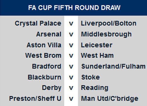 Theo lịch thi đấu, các trận thuộc vòng 5 FA Cup diễn ra trong 2 ngày cuối tuần (14 và 15/2/2015). Sau khi Man City và Chelsea bất ngờ bị loại ở vòng đấu trước, cơ hội để Arsenal bảo vệ ngôi vương ở sân chơi này trở nên lớn hơn.