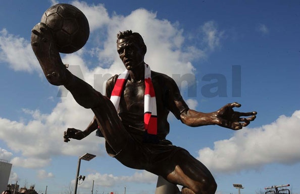 | Bức tượng này mô phỏng theo tình huống khống chế bóng trên không đẹp mắt của Bergkamp trong trận đấu với Newcastle. |