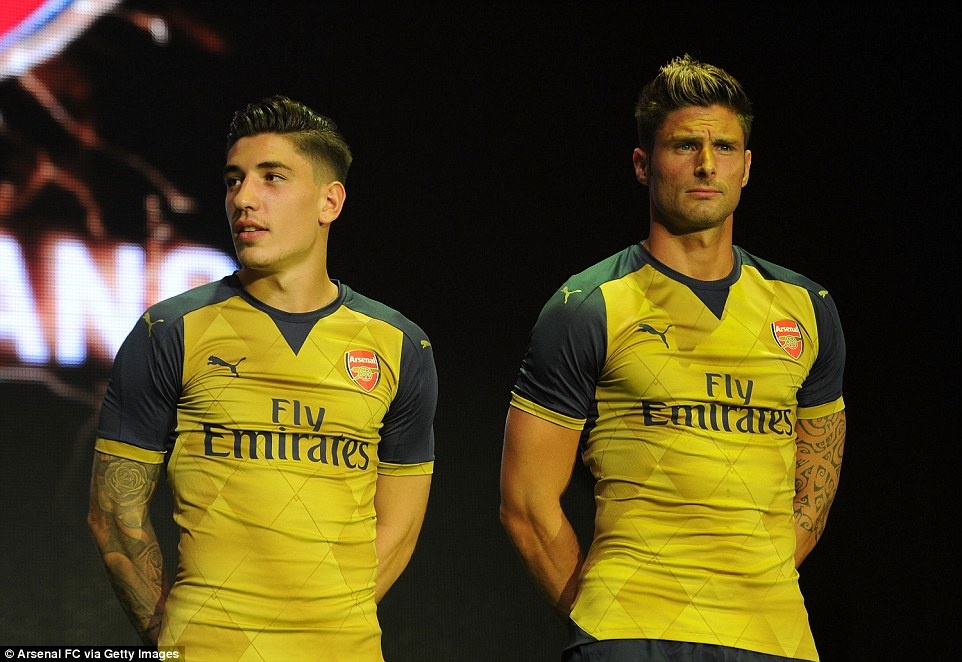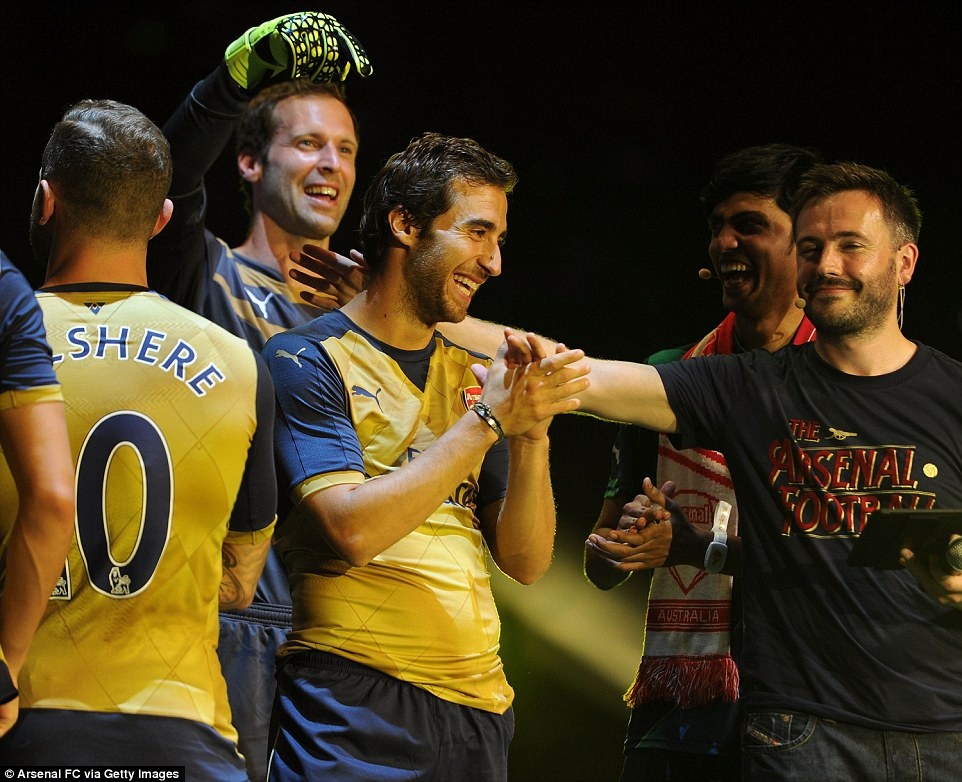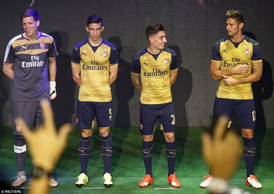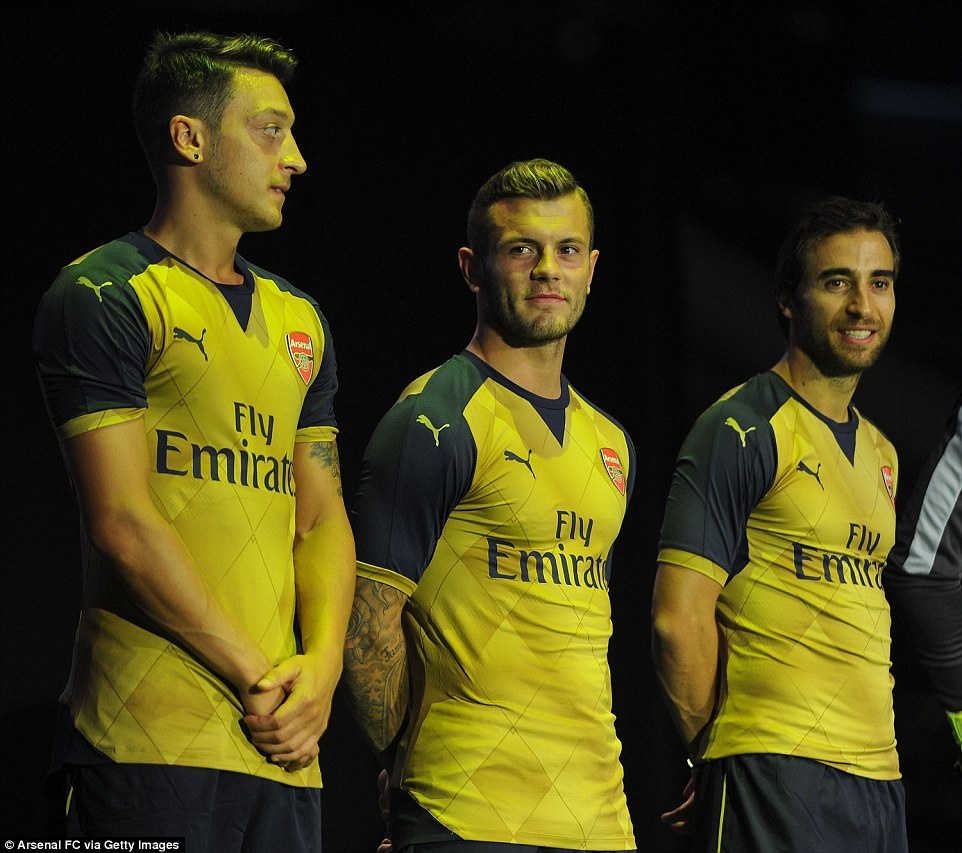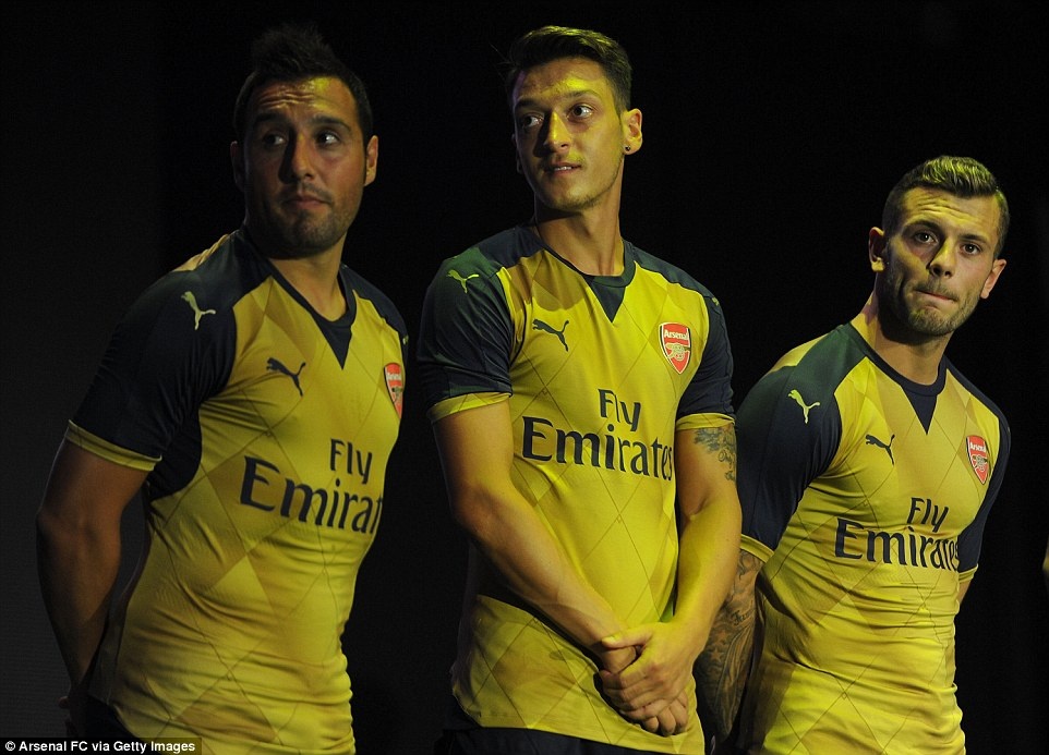 | Tiền vệ Mesut Oezil (trái) và các đồng đội tham gia buổi giới thiệu áo đấu sân khách mùa giải 2015 - 2016. |