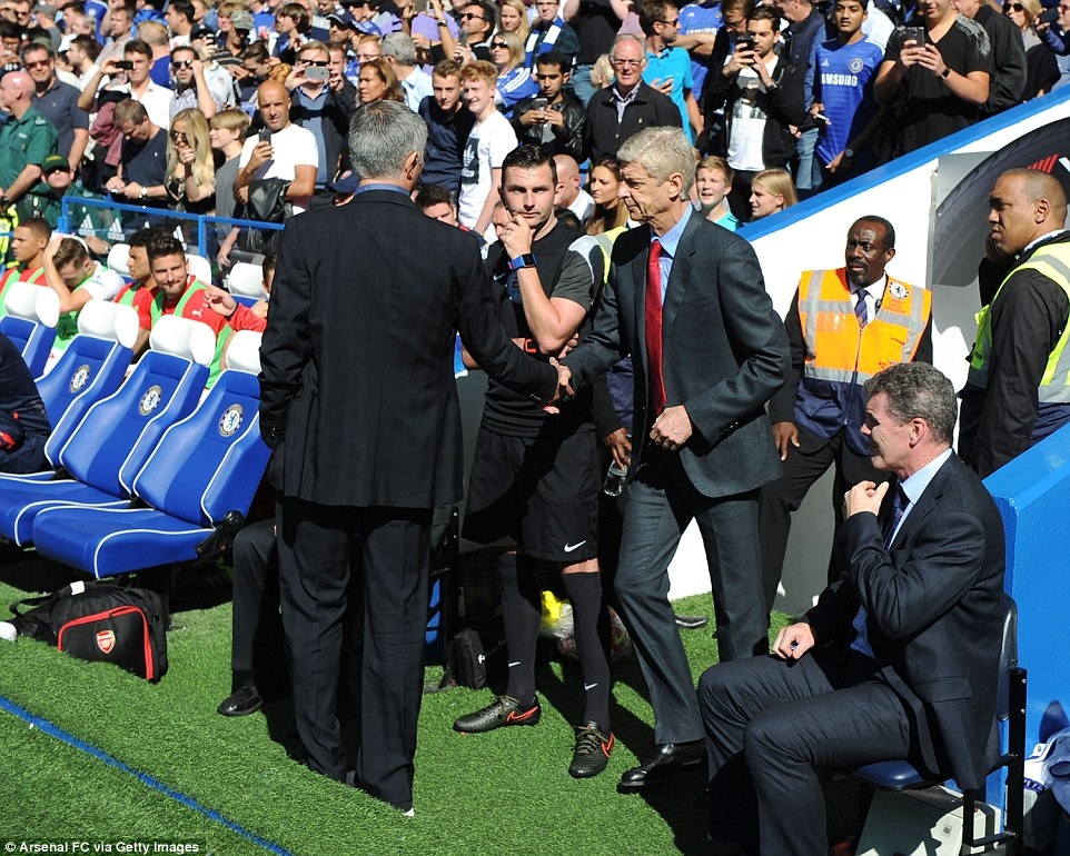 Trước khi trận đấu giữa Chelsea và Arsenal trên sân Stamford Bridge diễn ra, huấn luyện viên (HLV) Jose Mourinho chờ bắt tay đồng nghiệp Arsene Wenger bên phía đội khách. Trước đó, hai nhà cầm quân này không bắt tay xã giao sau khi trận tranh siêu cúp Anh 2015 kết thúc.