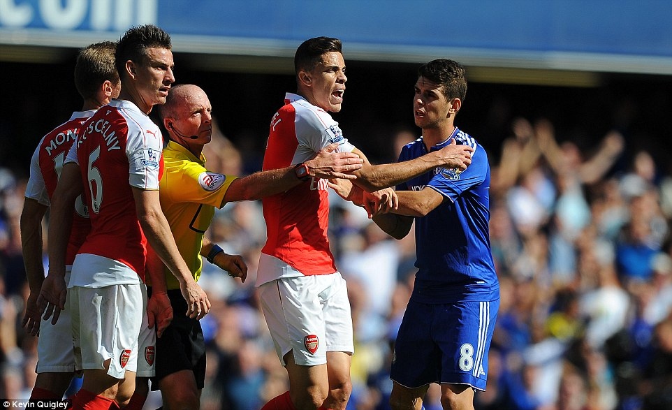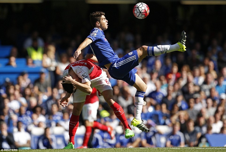 Trung vệ Koscielny tranh bóng quyết liệt với tiền vệ Oscar của Chelsea. Trận đấu bị gián đoạn, bởi những pha phạm lỗi của cầu thủ hai đội.