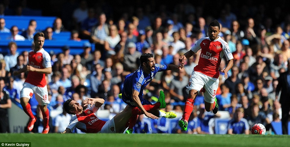 Tiền đạo Diego Costa nhận được sự chăm sóc rất kỹ của hàng phòng ngự Arsenal.
