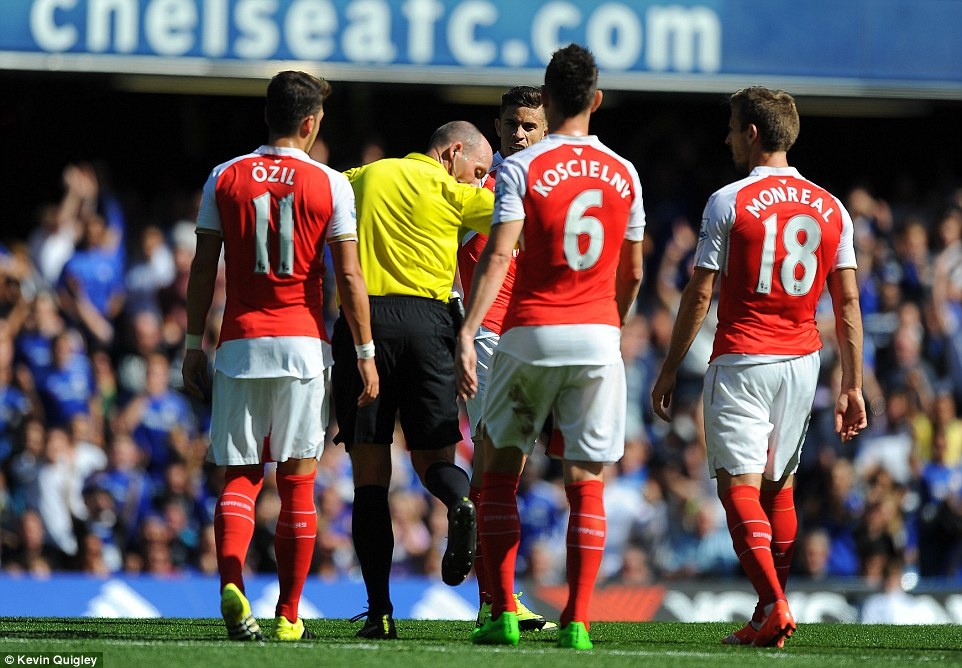 Derby thành London diễn ra với nhiều pha va chạm mạnh. Tiền vệ Coquelin của Arsenal bị đau trong tình huống tranh bóng với Matic bên phía Chelsea. Đồng đội Theo Walcott hỏi thăm Coquelin.