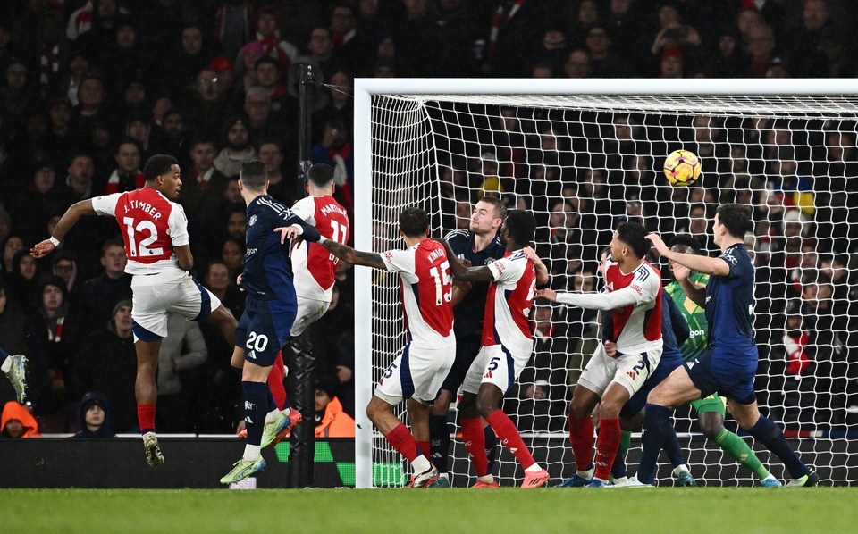 Rạng sáng 5/12 (giờ Hà Nội), Arsenal đánh bại Manchester United 2-0 ở vòng 14 Premier League trên sân nhà Emirates. Điều đáng chú ý, "Pháo thủ" giành chiến thắng khi ghi bàn bằng 2 quả phạt góc. Timber và Saliba là hai người ghi bàn cho Arsenal.