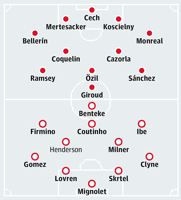 | Đội hình dự kiến của Arsenal và Liverpool ở trận đấu muộn thuộc vòng 3 Premier League diễn ra lúc 2h ngày 25/8. Ảnh: Guardian. |