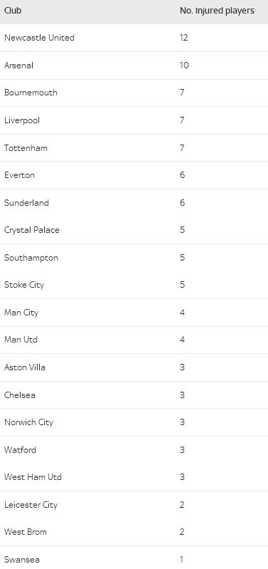 Theo thông tin đăng trên trang Physioroom, Newcastle là đội có số cầu thủ dính chấn thương nhiều nhất trước vòng 12 Premier League. Huấn luyện viên Steve McClaren không có sự phục vụ của 12 cầu thủ.