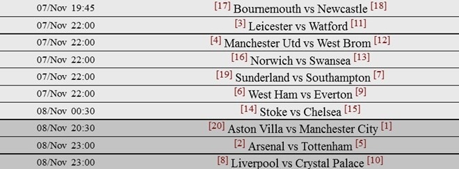 | Lịch thi đấu vòng 12 Ngoại hạng Anh diễn ra cuối tuần này. Arsenald đón tiếp Tottenham trên sân nhà Emirates lúc 23h ngày 8/11. |