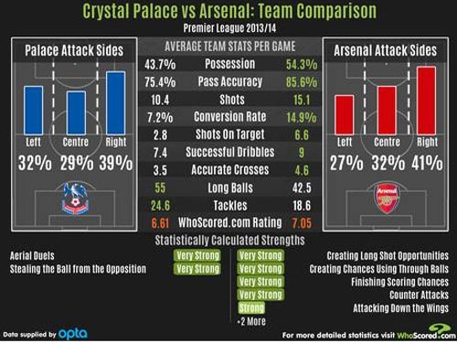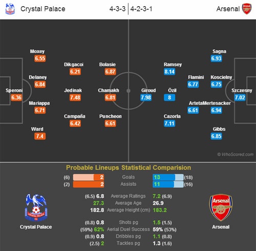 Nhiệm vụ của đội chủ nhà là phải hạn chế bàn thua. Trong 5 trận đấu gần đây, mành lưới của Crystal Palace đã bị chọc thủng tới 13 lần. Đối đầu với hàng công đang có phong độ tốt của Arsenal (18 bàn/8 trận), Crystal Palace sẽ có 90 phút khó khăn dù được chơi trên sân nhà Selhurst Park.